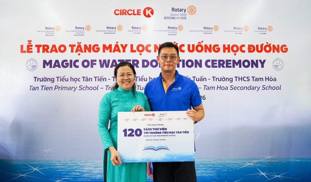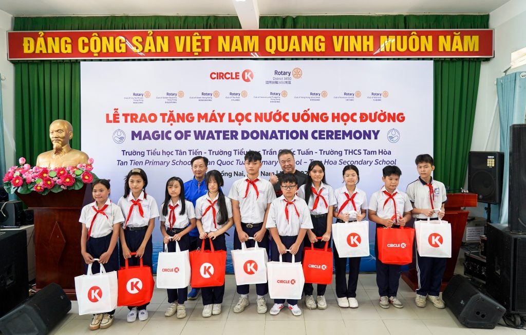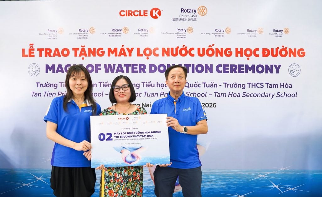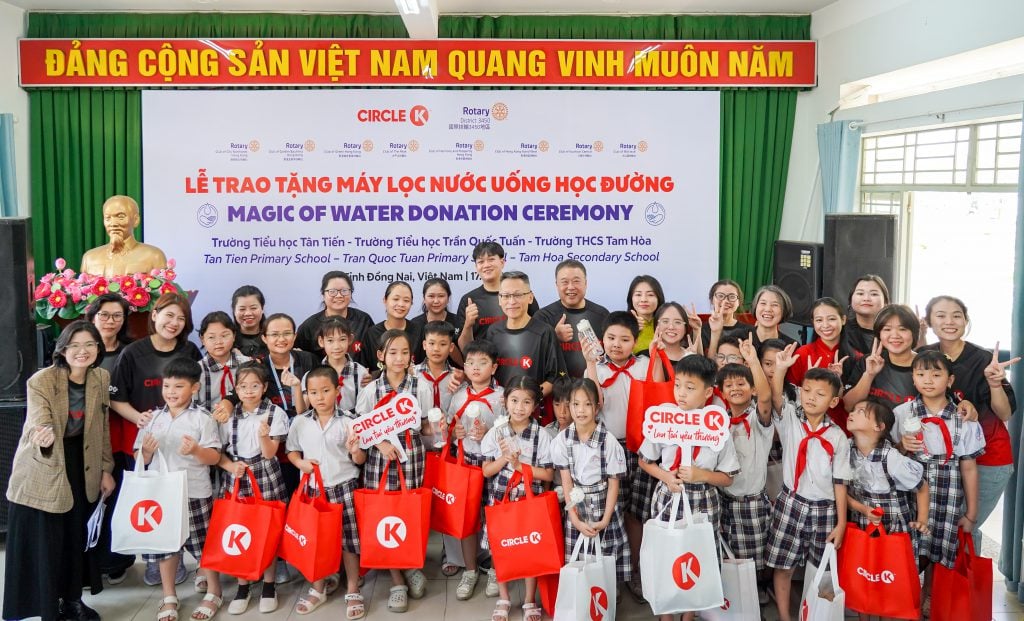 On April 17, 2026, Circle K Vietnam organized the school water purifier donation ceremony “Magic of Water 2026”: 07 water purifiers were installed, along with 08 filter sets, 120 children’s books, and 80 gift packages delivered to pupils across three schools in Tam Hiep Ward, Dong Nai Province.