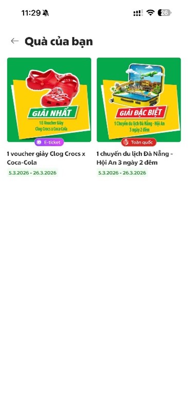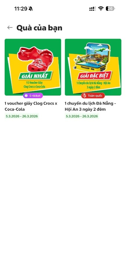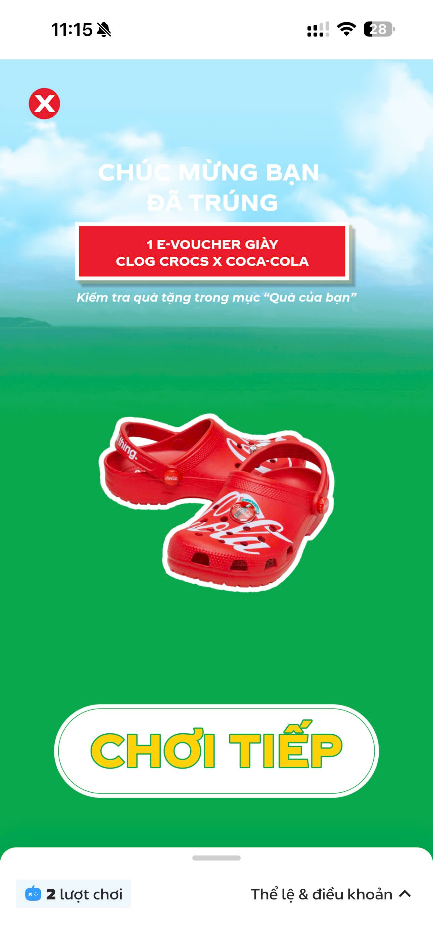 – Khách hàng trúng thưởng giải E-Voucher Giày Clog Crocs x Coca-Cola khi màn hình trả ra kết quả thông báo trúng thưởng như sau: