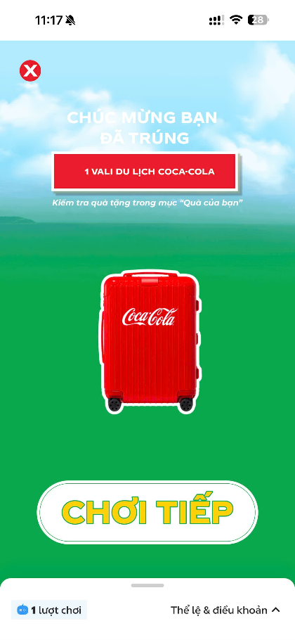 – Khách hàng trúng thưởng giải Vali du lịch Coca-Cola khi màn hình trả ra kết quả thông báo trúng thưởng như sau:
