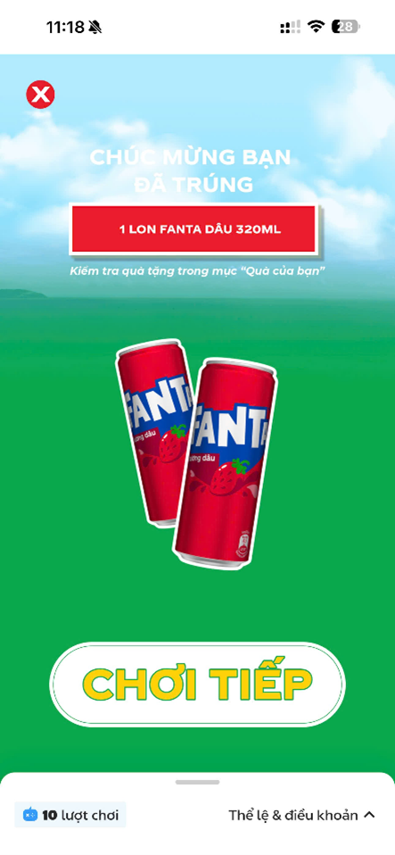 – Khách hàng trúng thưởng giải Lon Fanta hương dâu 320ml khi màn hình trả ra kết quả thông báo trúng thưởng như sau: