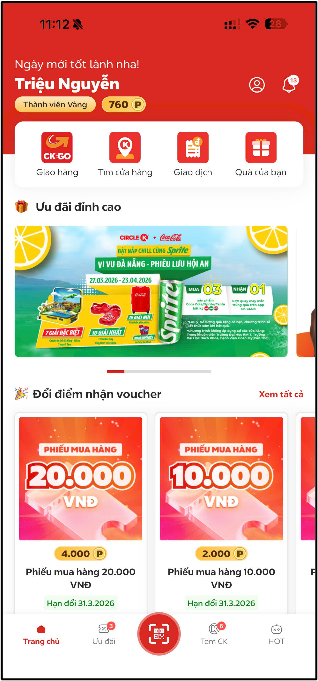 Khách hàng tham gia chương trình tiến hành mở ứng dụng CK Club trên thiết bị dùng để đăng ký tài khoản, ứng dụng CK Club được tự động đăng nhập vào tài khoản khách hàng đã đăng ký trước đó, sau đó bấm vào mã QR Code ở góc dưới giữa màn hình “Trang chủ” như hình 4 để tiến hành quét mã tham gia chương trình.