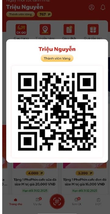 + Bước 3: Bấm chọn mã QR Code ở góc dưới giữa màn hình “Trang chủ” (Màn hình hiển thị như hình 4 nêu trên) và đưa mã khách hàng (Mã QR code) cho nhân viên cửa hàng khi thanh toán đơn hàng;