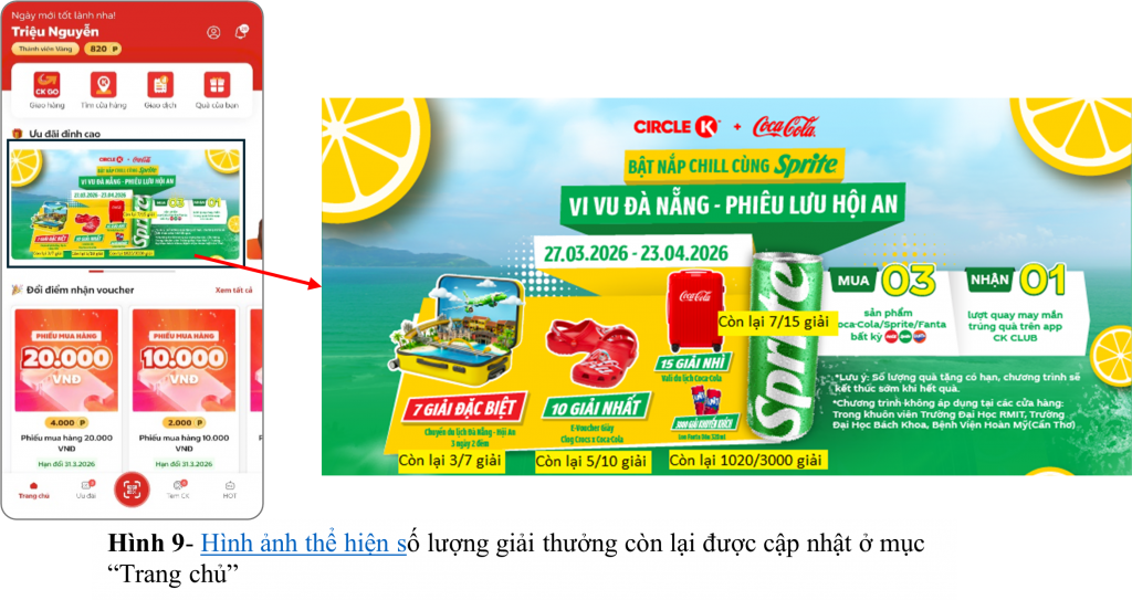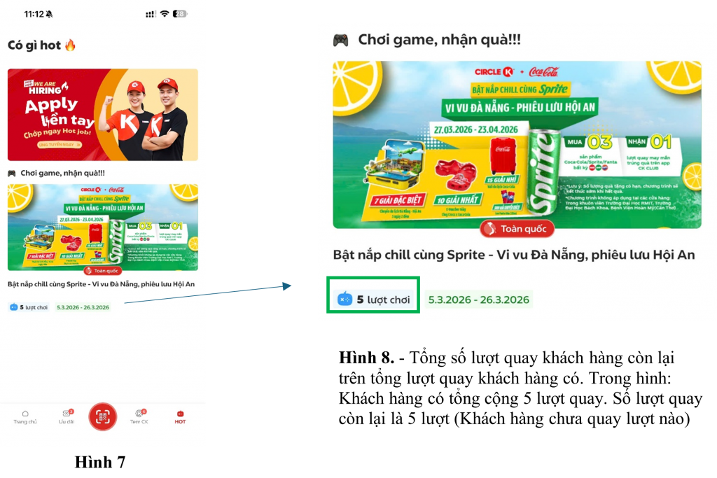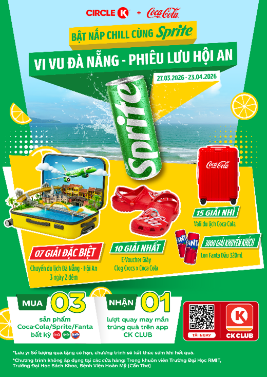 – Từ 00h01 ngày 27/03/2025 đến 23h59 ngày 23/04/2026, khách hàng mua 3 sản phẩm bất kỳ của Công ty TNHH Nước Giải Khát Coca-Cola Việt Nam thuộc các nhãn hiệu Coca-Cola, Sprite, Fanta tại hệ thống cửa hàng Circle K trên phạm vi toàn quốc sẽ nhận ngay 01 lượt quay may mắn trúng thưởng trên app CK-Club.