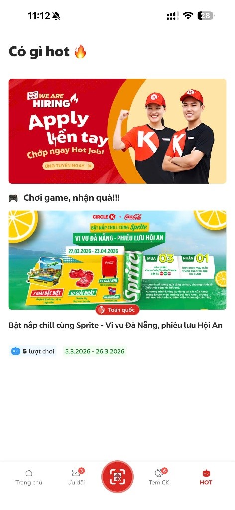 Thứ hai: Khi mua 3 sản phẩm bất kỳ của Công ty TNHH Nước Giải Khát Coca-Cola Việt Nam thuộc các nhãn hiệu Coca-Cola, Sprite, Fanta tại hệ thống cửa hàng Circle K trên phạm vi toàn quốc sẽ nhận ngay 01 lượt quay may mắn trúng thưởng trên ứng dụng CK Club trong phần “HOT” như hình.