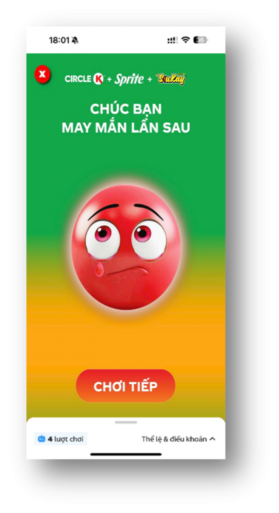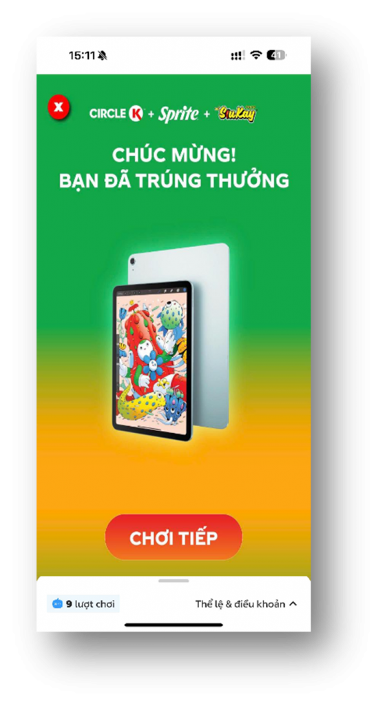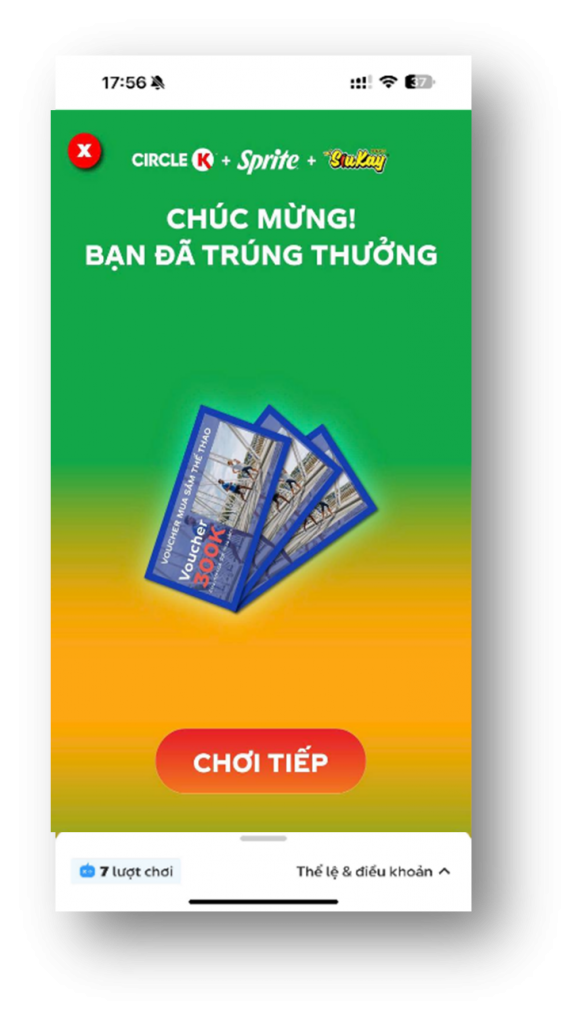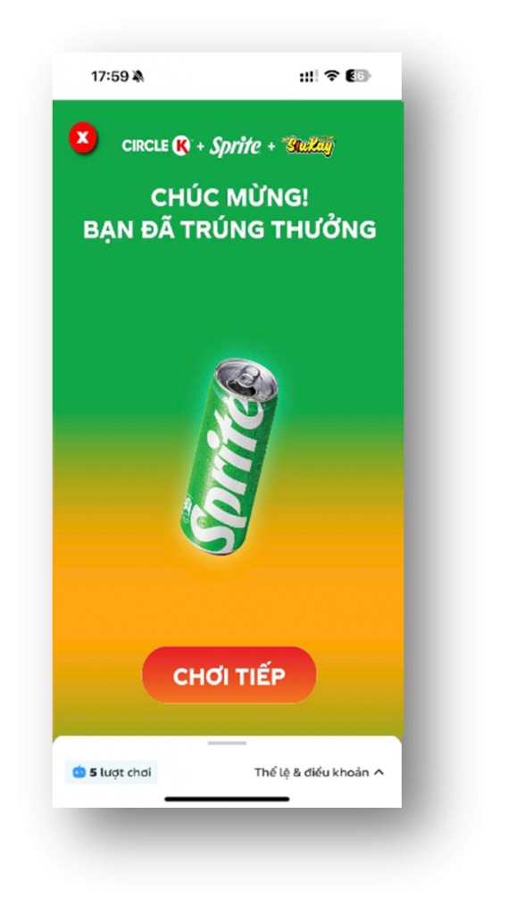 - Khách hàng trúng thưởng giải 1 Lon sprite 320ml khi màn hình trả ra kết quả thông báo trúng thưởng như sau: