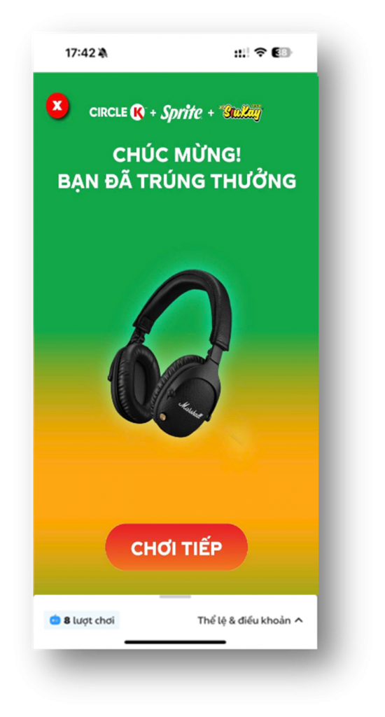 - Khách hàng trúng thưởng giải Tai nghe bluetooh chụp tai Marshall Major 5 khi màn hình trả ra kết quả thông báo trúng thưởng như sau: