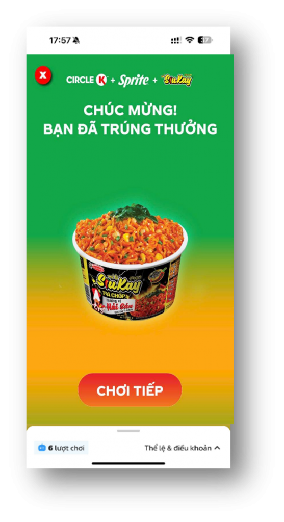 - Khách hàng trúng thưởng giải Mì Tô Vị Hải Sản SiuKay 97g khi màn hình trả ra kết quả thông báo trúng thưởng như sau: