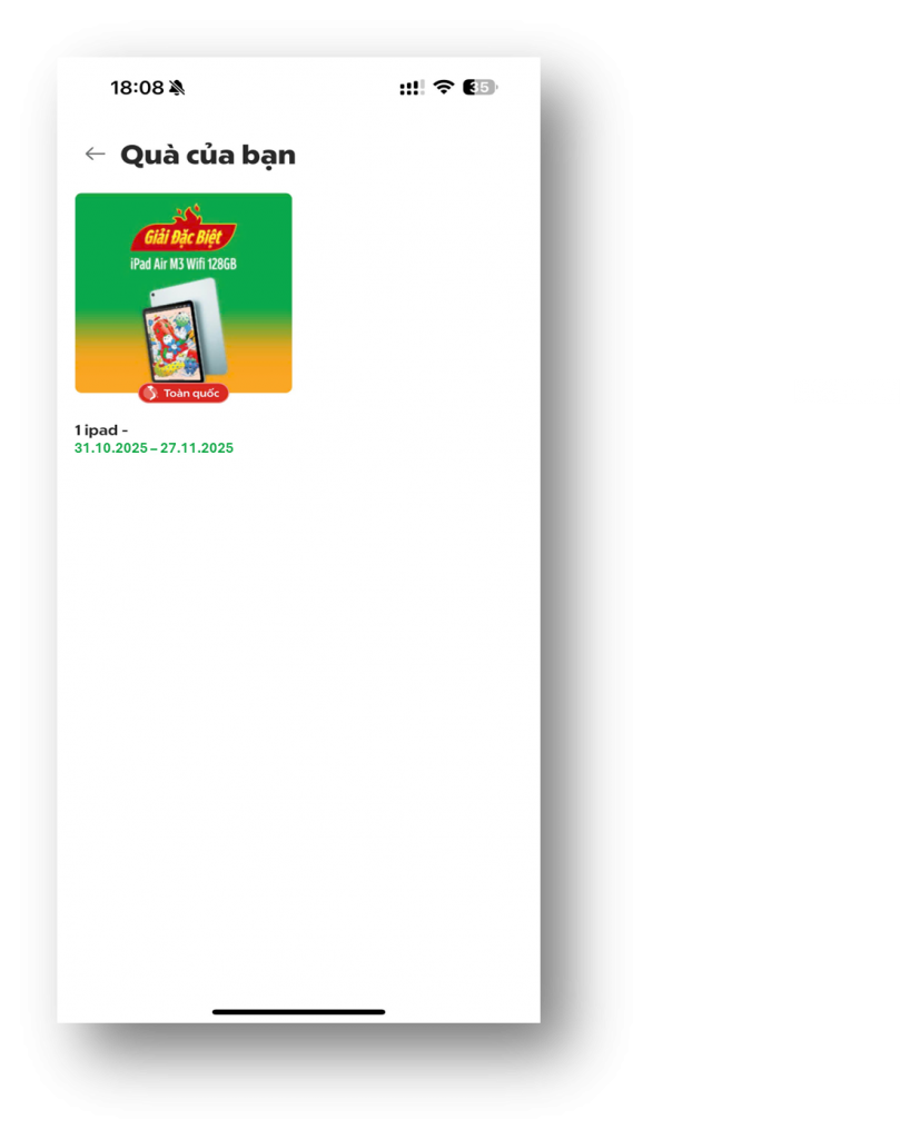 • Khách hàng trúng thưởng giải Máy tính bảng Ipad air m3 11inch wifi 128GB khi màn hình trả ra kết quả thông báo trúng thưởng như sau: