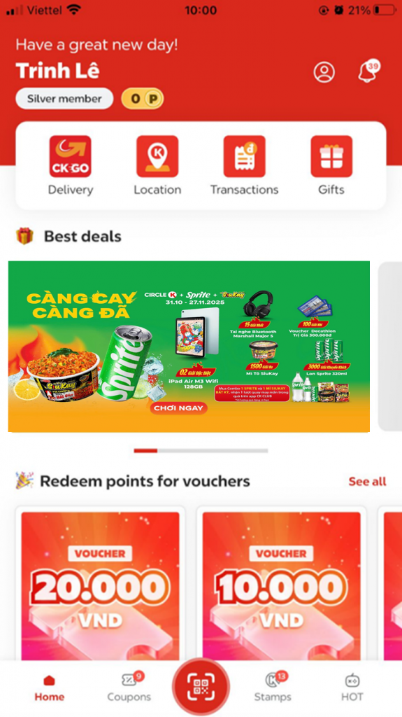 • Khách hàng nhận bằng cách mở ứng dụng CK Club, vào mục “Quà của bạn” để kiểm tra hình ảnh xác nhận trúng thưởng. Lấy sản phẩm tương ứng tại tất cả các cửa hàng Circle K trong lãnh thổ Việt Nam. Nhân viên cửa hàng sẽ quét mã khách hàng và quét sản phẩm sau đó trao cho khách.
