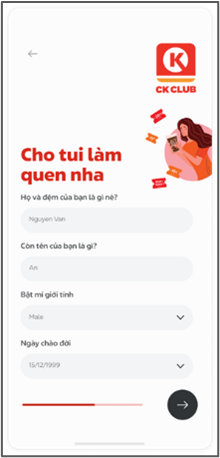 Hình 3 Khách hàng tiến hành điền thông tin cá nhân vào các mục như hình gồm (Họ và tên đệm, Tên, Giới tính, Ngày sinh) và bấm mũi tên. Màn hình hiển thị như trên |