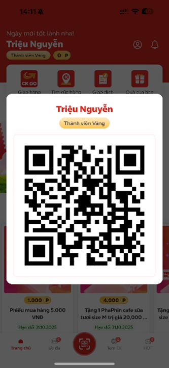 Khách hàng tham gia chương trình tiến hành mở ứng dụng CK Club trên thiết bị dùng để đăng ký tài khoản, ứng dụng CK Club được tự động đăng nhập vào tài khoản khách hàng đã đăng ký trước đó, sau đó bấm “My ID” hệ thống sẽ hiển thị màn hình như hình 6 để tiến hành quét mã tham gia chương trình.