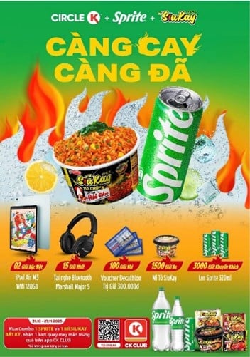 – Từ 00:01’ ngày 31/10/2025 đến 23:59’ ngày 27/11/2025 Khách hàng đến hệ thống cửa hàng tiện lợi Circle K trên phạm vi toàn quốc và mua Combo gồm 1 Sprite bất kỳ và 1 mì SiuKay bất kỳ sẽ nhận ngay 01 lượt quay may mắn trúng thưởng trên app CK-Club
