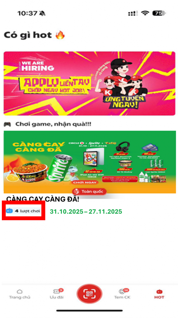Hình 9 Nhiều lượt quay sẽ tương ứng với số lượt chơi hiển thị ở mục “HOT”. Lượt quay đã được quay sẽ hết hiệu lực và biến mất khỏi mục “HOT” của ứng dụng CK Club trong vòng tối đa 01 giờ đồng hồ kể từ khi khách hàng thực hiện quay thưởng. |